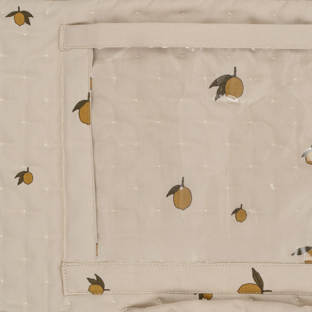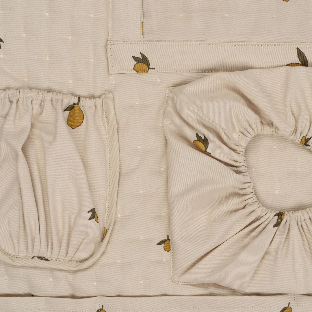 Auto-Organizer aus 100 % Bio-Baumwolle mit einer Füllung aus recyceltem Polyester. Der tragbare Organizer ist leicht zu transportieren und hat verstellbare Riemen, die an der Kopfstütze und am Autositz befestigt werden. Er ist mit einem Tablet-Fach und Taschen in verschiedenen Grössen ausgestattet, unter anderem einer Tasche für Feuchttücher. Auf diese Weise erleichtert er die ordentliche Aufbewahrung wichtiger Utensilien. An dem elastischen Band mit Klettverschluss lassen sich ausserdem ein Spielzeug oder eine Schnullerhülle aufhängen.