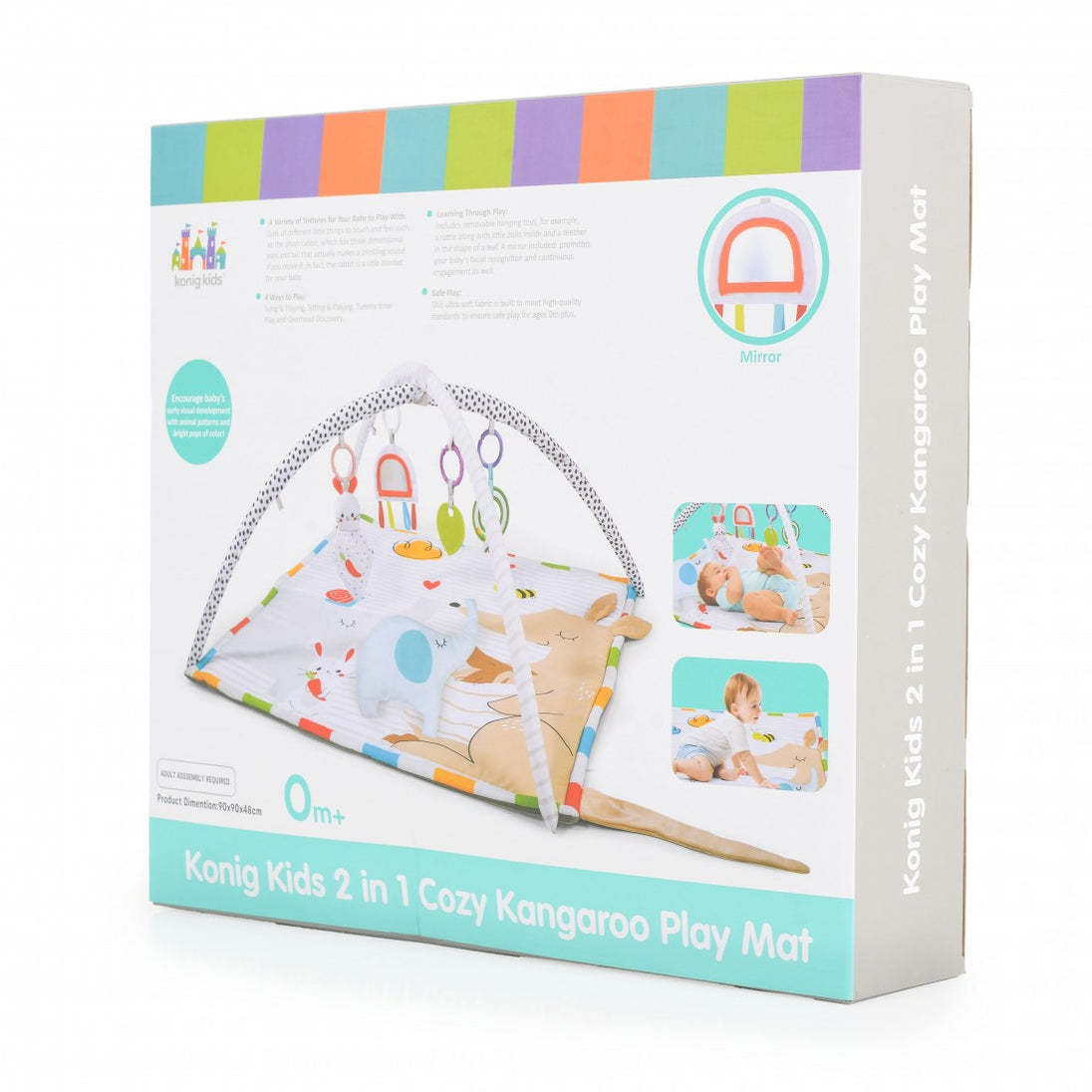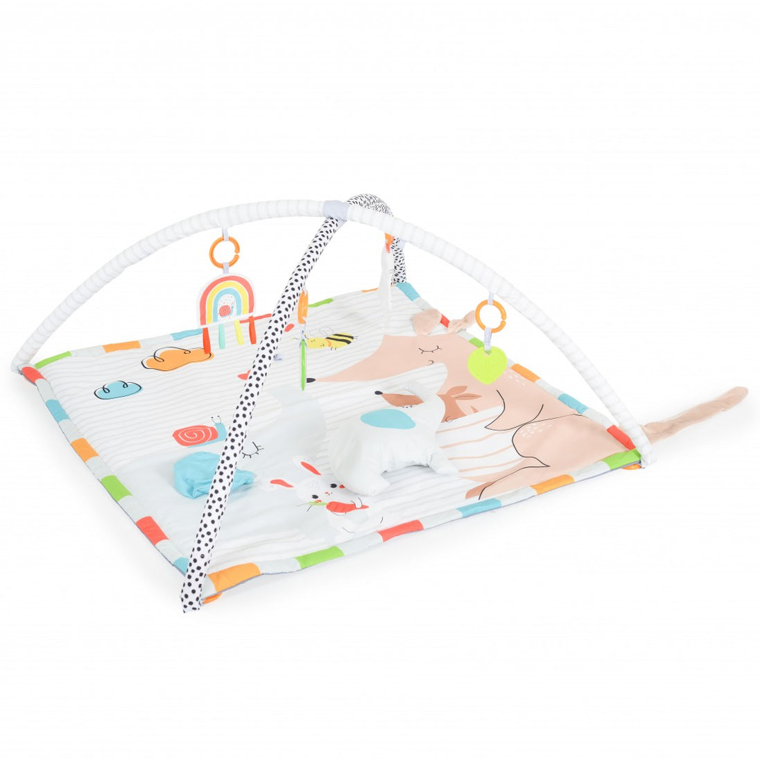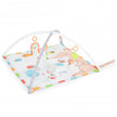 Das Produkt ist für Kinder ab 0 Monaten geeignet. Es handelt sich um eine Spielmatte mit drei Spielpositionen – auf dem Rücken, auf dem Bauch und im Sitzen. Im Set enthalten sind verschiedene Spielzeuge, ein Kissen und abnehmbare Spielbögen. Die Spielmatte besteht aus ungiftigen und kindersicheren Materialien. Das Produkt fördert den Intellekt, die Hand- und Fussmotorik sowie das Erkennen verschiedener Formen und Farben. Material: 100 % Polyester, PP.