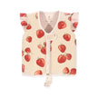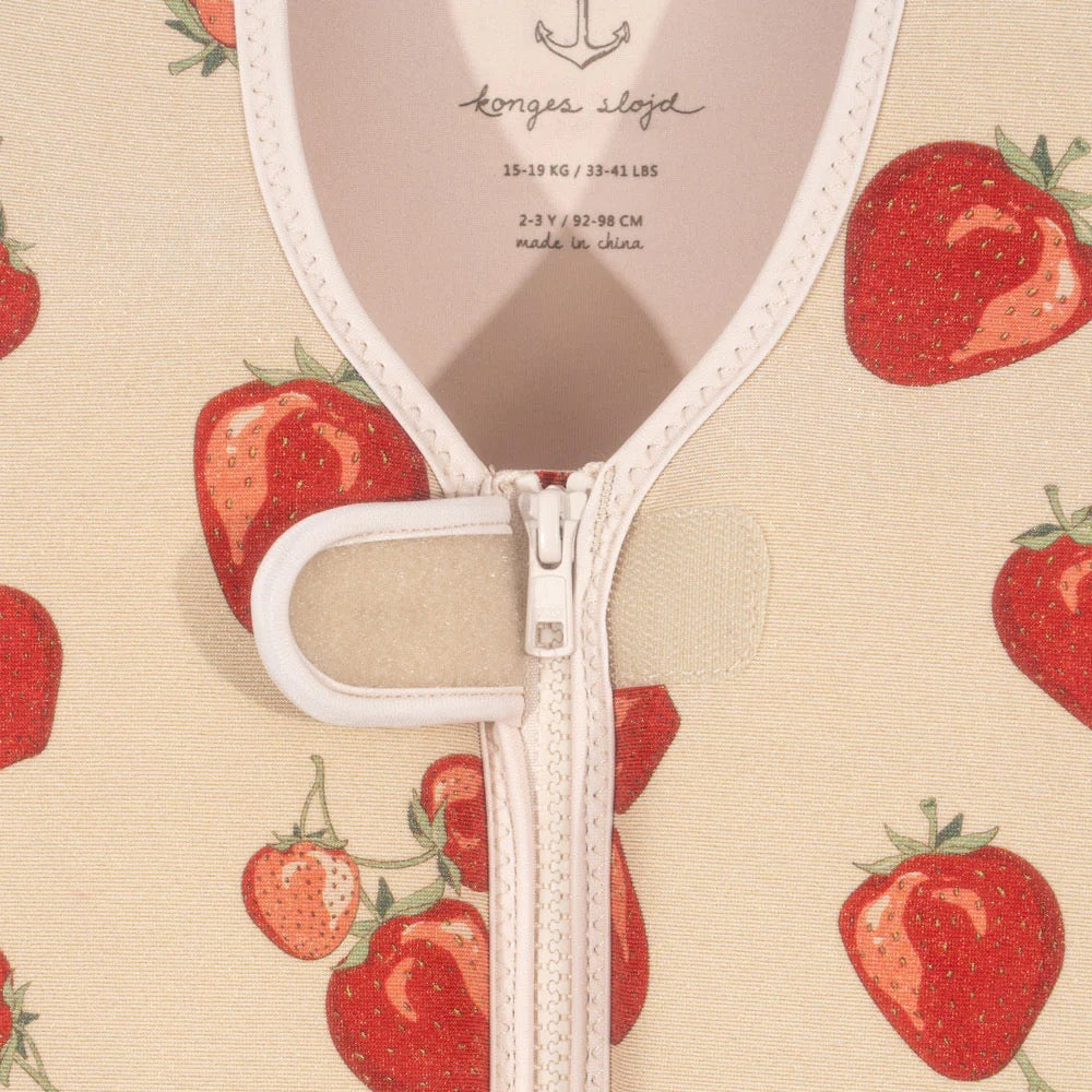Life jacket with a shimmering effect and ruffle trim on the shoulders. It features a zipper and Velcro closure, as well as a safety belt with a buckle at the crotch.