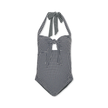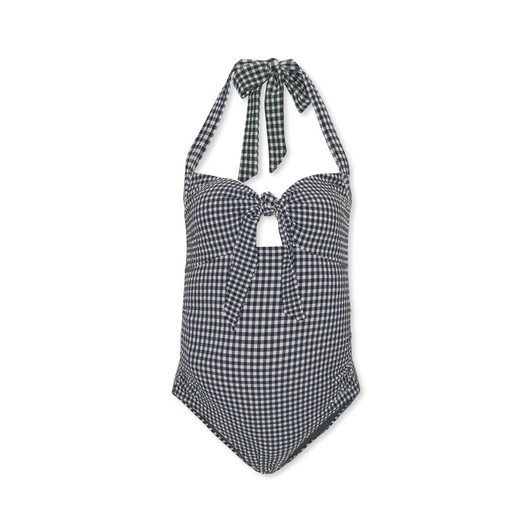 Maternity swimsuit made of 48 percent recycled polyester, 44 percent polyamide, and 8 percent elastane. The swimsuit offers room for a growing baby bump and easy access for breastfeeding. The front, back, and neck closures can be adjusted for a perfect fit. Designed with removable nursing pads and a soft seersucker effect.