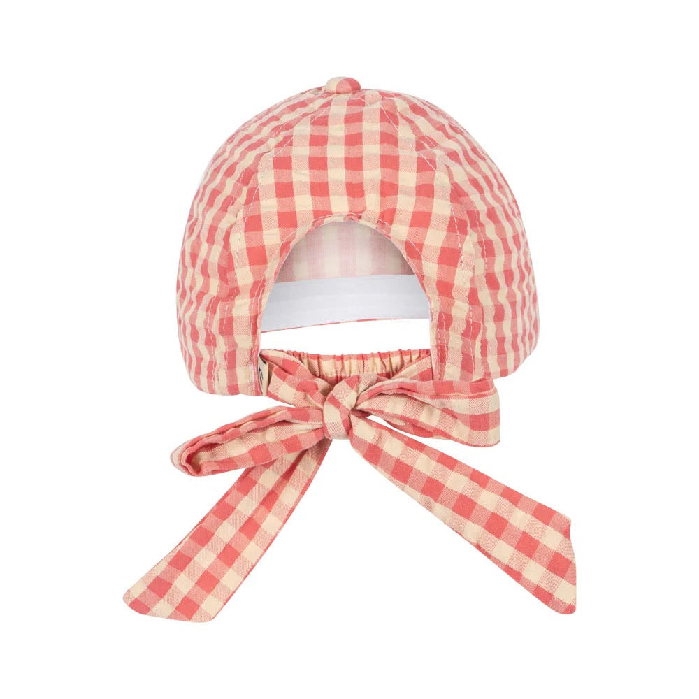 Chapeau en seersucker avec un bord fixe à l'avant et un lien souple à l'arrière.