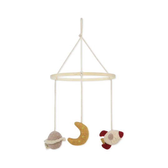Mobile avec anneau en bois et figurines souples en 80 pour cent laine de mouton et 20 pour cent nylon.
